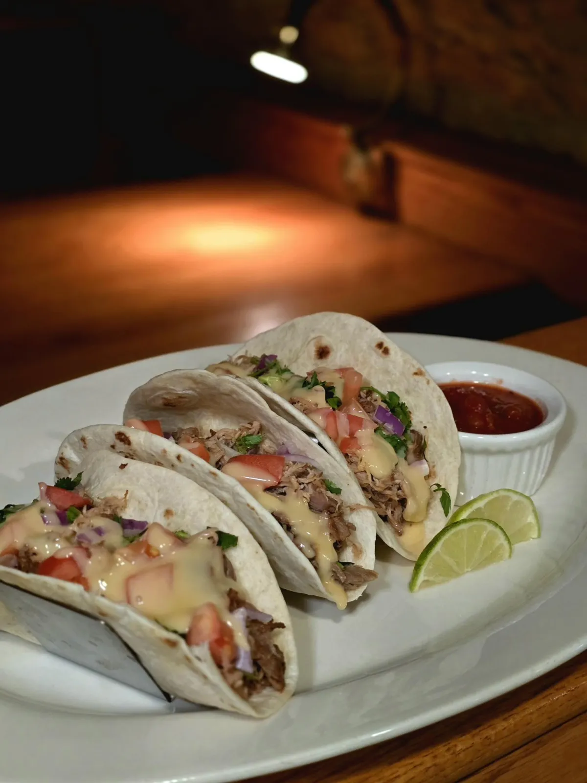3 Soft Tortillas - Pork Carnitas - Queso - Cilantro - Tomato - Onion - Salsa - Sour Cream served with a side of lime